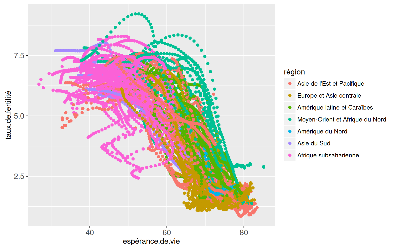 x=espérance.de.vie, y=taux.de.fertilité, color=région,