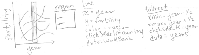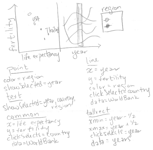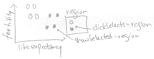 Dans cette section, nous expliquerons comment le mot-clé clickSelects est implicitement utilisé dans les légendes interactives. Si vous avez lu les chapitres précédents, vous avez déjà utilisé implicitement clickSelects, qui a été créé automatiquement pour les légendes interactives dans les chapitres précédents. Considérons l’esquisse de la visualisation de données de la Banque mondiale présentée au dernier chapitre.