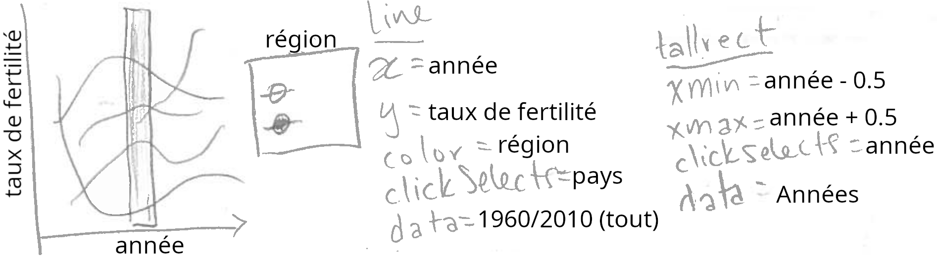 La visualisation de données interactives ci-dessus contient un nouveau panneau avec des lignes qui montrent une série temporelle de taux de fertilité sur toutes les années. Puisque nous avons précisé clickSelects=pays pour le geom_line, un clic sur une ligne met à jour l’ensemble des pays sélectionnés. Puisque nous avons spécifié clickSelects=année pour le geom_tallrect, un clic sur un tallrect met à jour l’année sélectionnée.