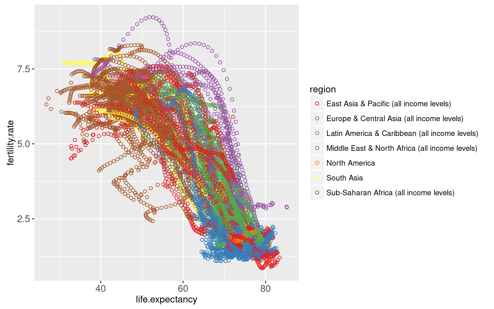 Note that scales="free" and xlab("") are used since the x axes now have very different units (year and life expectancy).