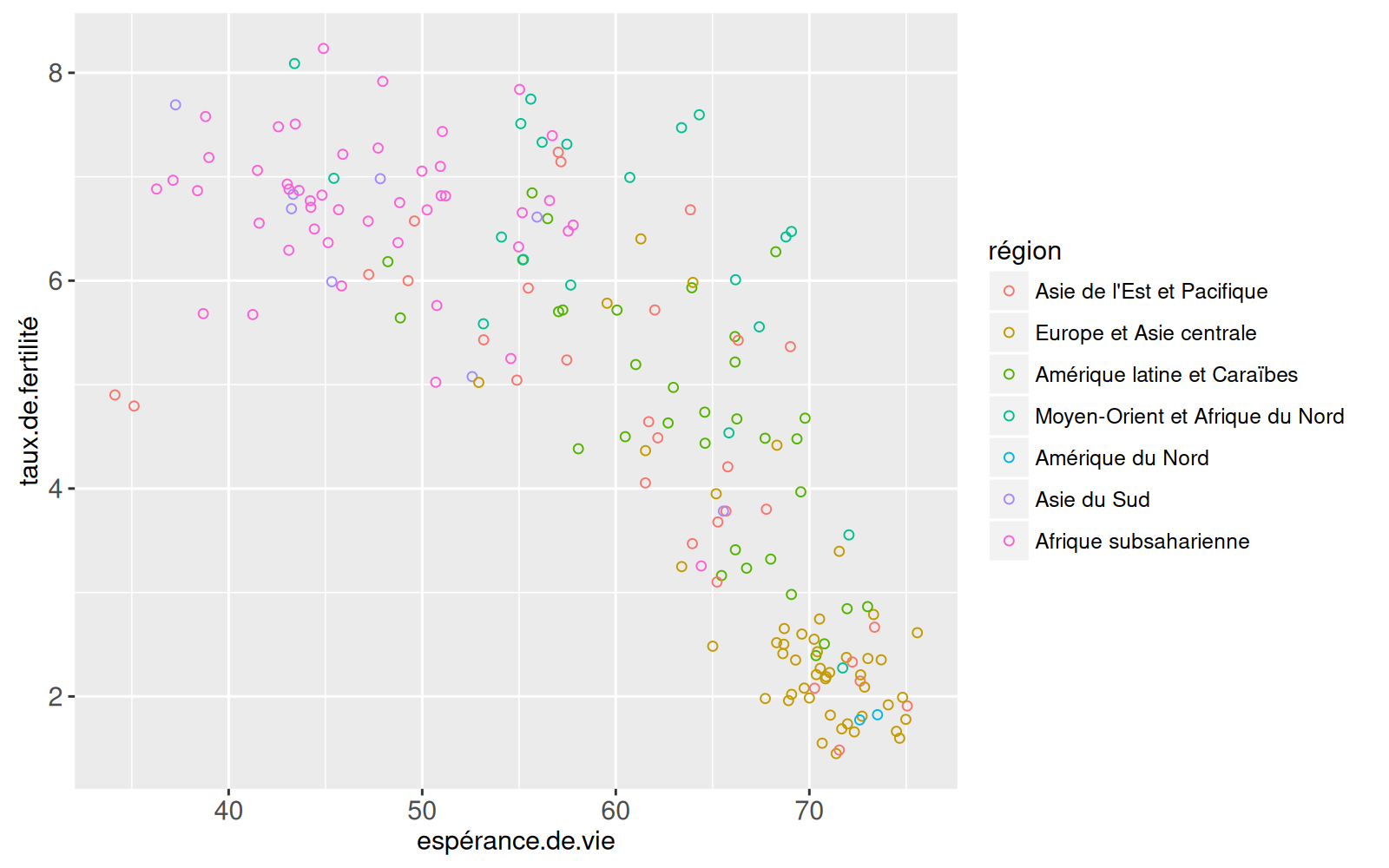 mapping=aes(x=espérance.de.vie, y=taux.de.fertilité, color=région),