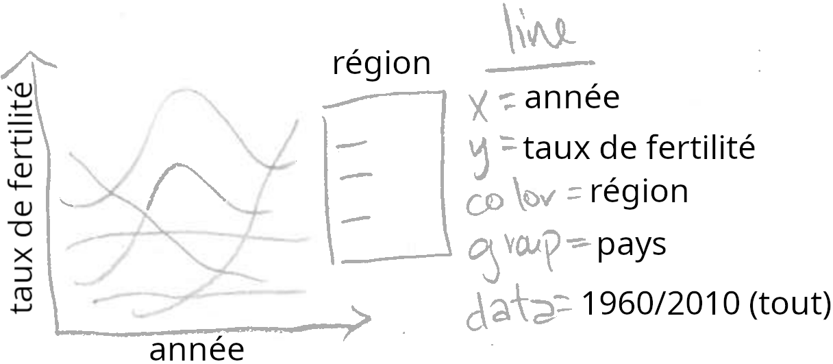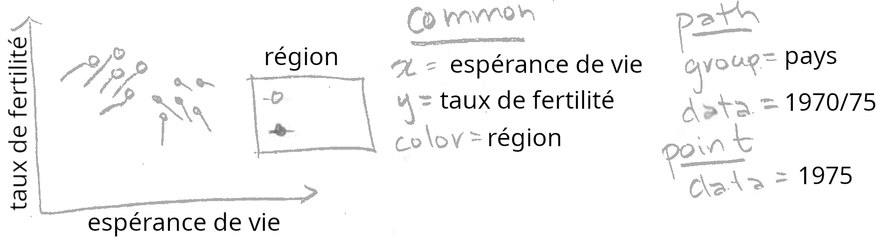 Il faut remarquer que l’esquisse ci-dessus comprend deux geoms différents (point et path). Les deux geoms partagent une définition commune des éléments x, y, et color, mais s’appliquent à des ensembles de données différents. De plus, le geom_path() contient group=pays, ce qui signifie qu’il faut dessiner une courbe pour chaque valeur de pays.