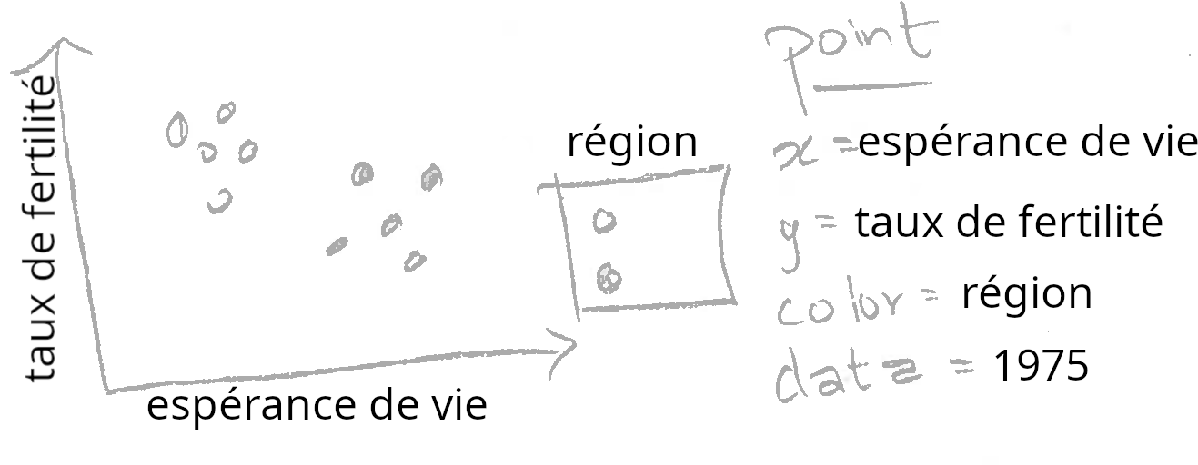 L’esquisse ci-dessus montre l’espérance de vie sur l’axe horizontal (x), le taux de fertilité sur l’axe vertical (y) et une légende pour la région. Ces éléments de l’esquisse peuvent être directement traduits en code R à l’aide de la méthode suivante. Tout d’abord, nous devons construire un tableau de données comportant une ligne par pays pour l’année 1975, et des colonnes nommées espérance.de.vie, taux.de.fertilité, et région. Le jeu de données banque_mondiale possède déjà ces colonnes, il suffit donc de considérer le sous-ensemble pour 1975 :