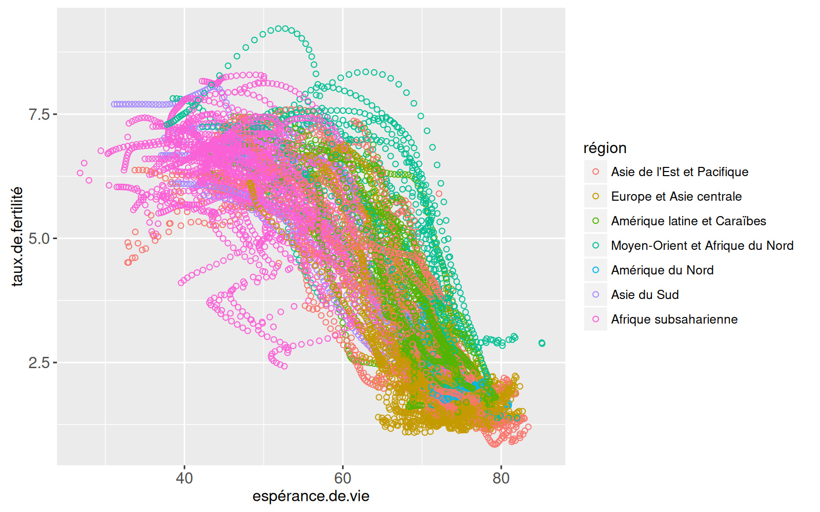 x=espérance.de.vie, y=taux.de.fertilité, color=région,