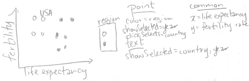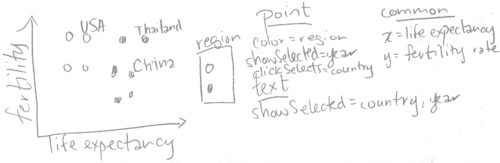 Dans cette section, nous expliquerons comment le mot-clé clickSelects est implicitement utilisé dans les légendes interactives. Si vous avez lu les chapitres précédents, vous avez déjà utilisé implicitement clickSelects, qui a été créé automatiquement pour les légendes interactives dans les chapitres précédents. Considérons l’esquisse de la visualisation de données de la Banque mondiale présentée au dernier chapitre.