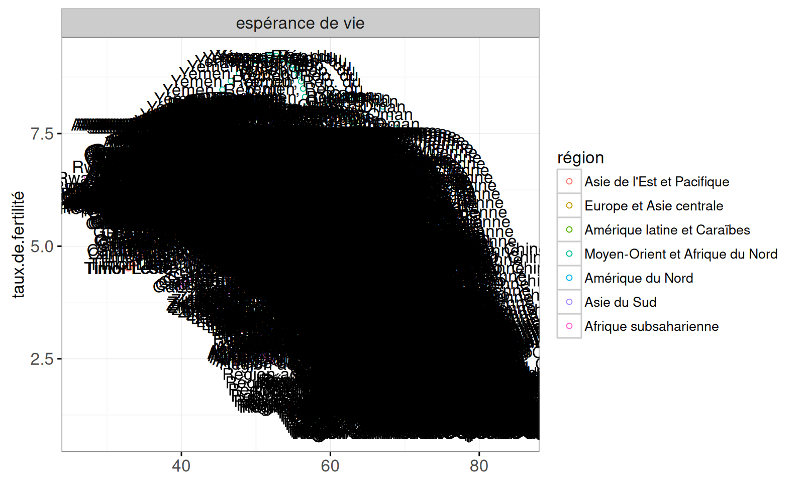 x=espérance.de.vie, y=taux.de.fertilité, color=région,