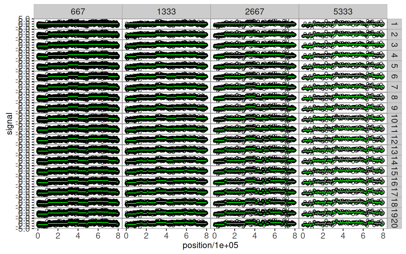 Le graphique ci-dessus comprend un geom_tallrect() avec clickSelects="segments" et un geom_line() avec clickSelects="bases.per.probe". Il servira à sélectionner les données et le modèle dans le graphique ci-dessous.