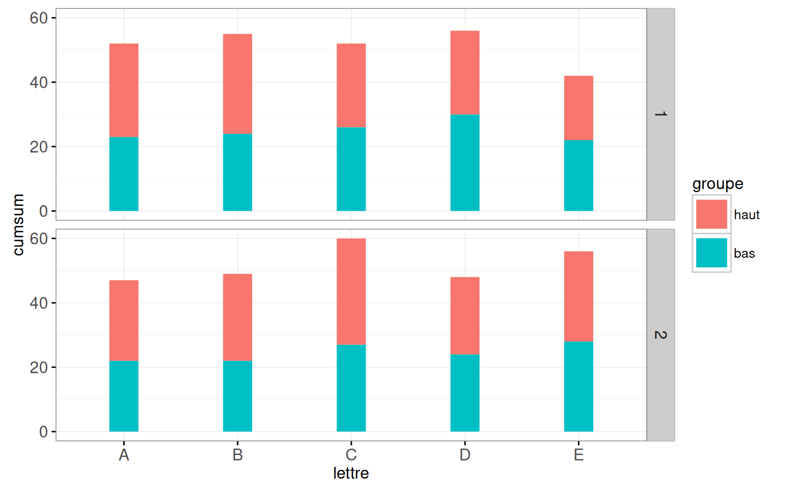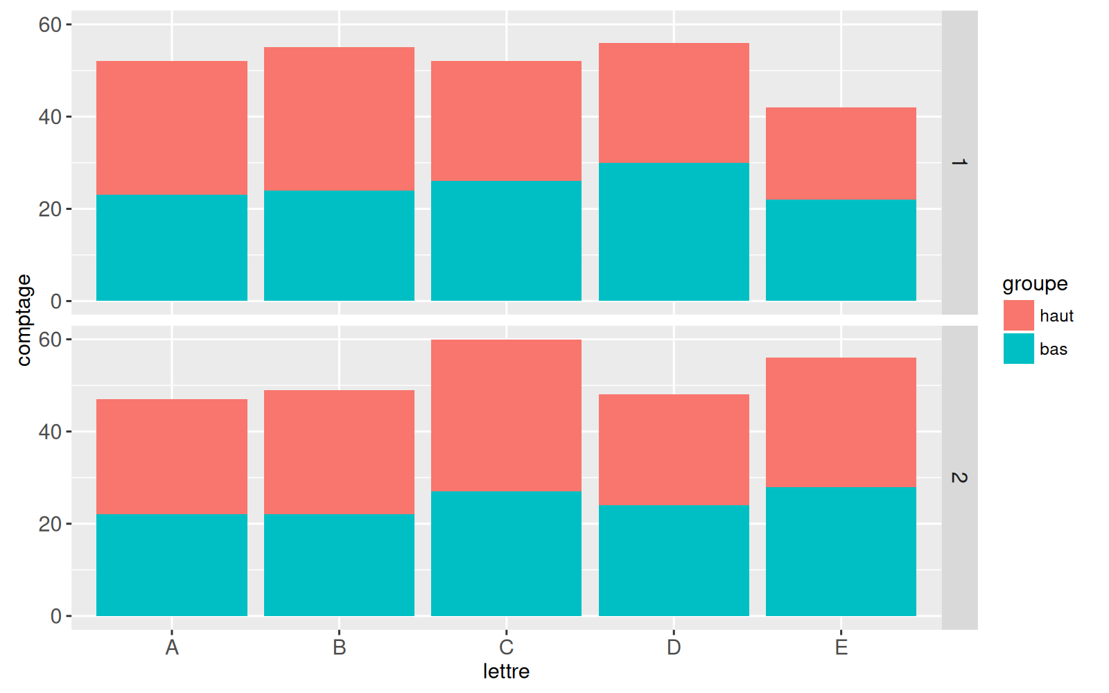 Dans le graphique ci-dessus, on constate que `position="stack"` aligne le groupe `bas` avec `comptage=0` dans chaque facette.