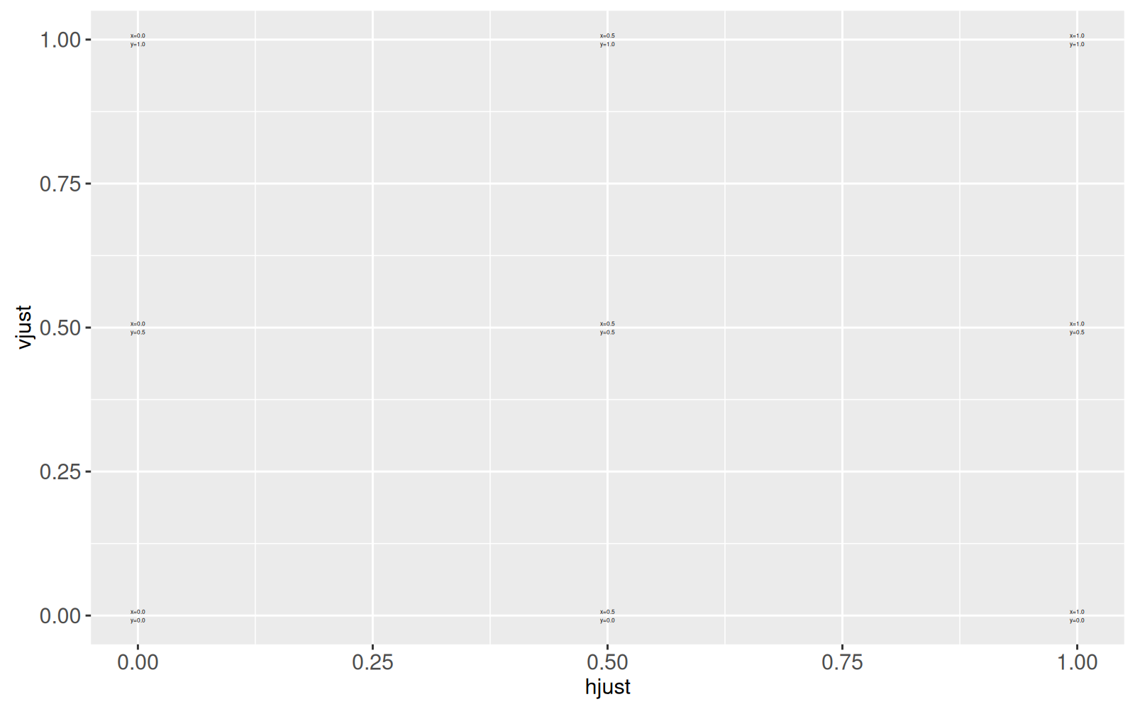 hjust, vjust, label=sprintf("x=%.1f\ny=%.1f", hjust, vjust)),