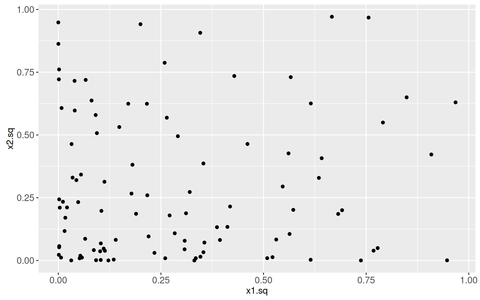 Next, we visualize the labels in the two-dimensional squared feature space. It is clear that the decision boundary is linear in this space.