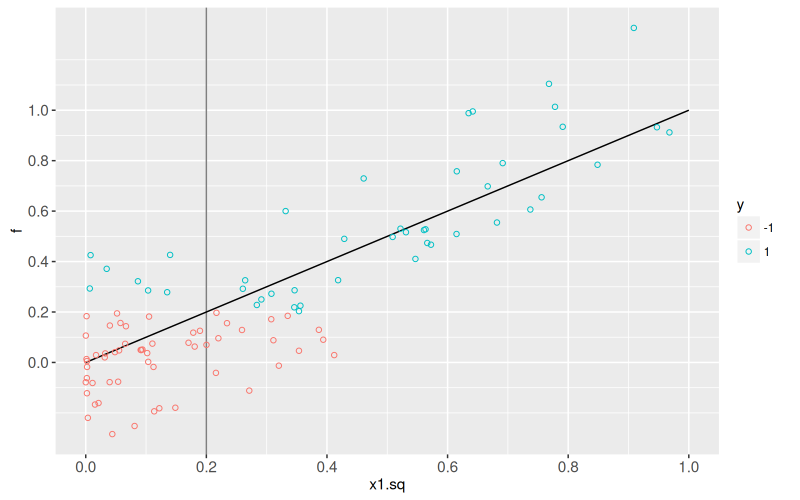 The plot below shows the scores and labels, as a function of the squared feature x1.sq. It is clear that the score function that we want to learn is linear in x1.sq.