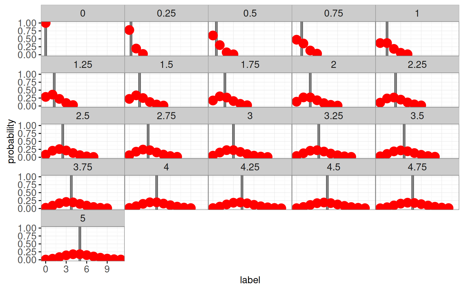 Note that for integer values of the Poisson mean, there are two labels that are the most probable (the mode of the Poisson distribution).