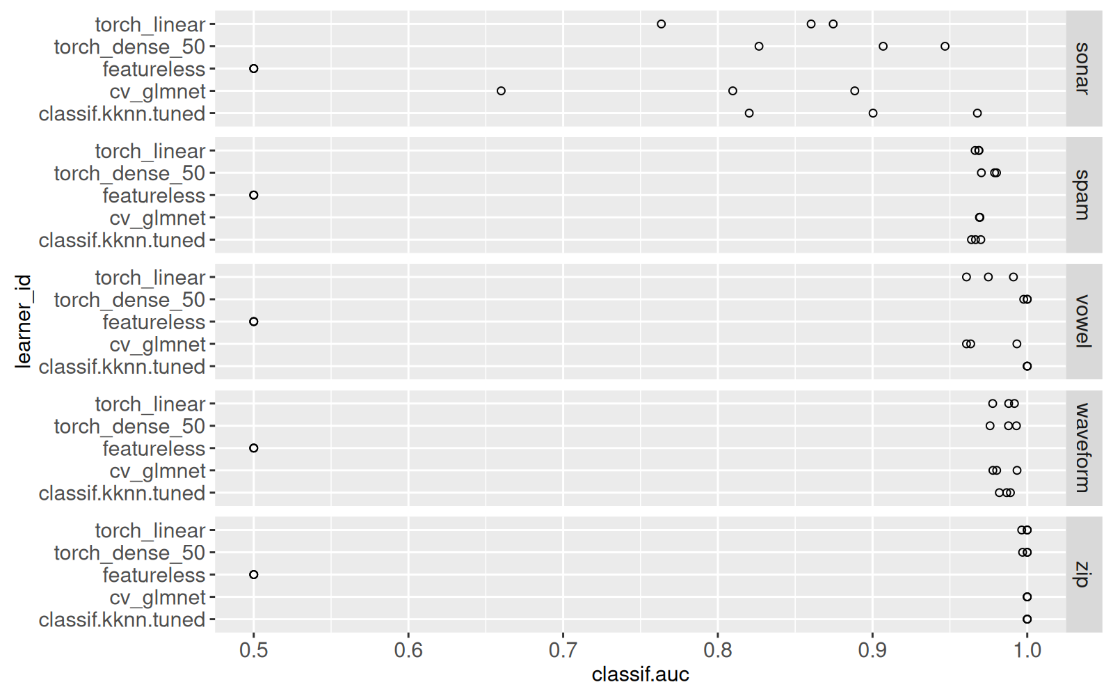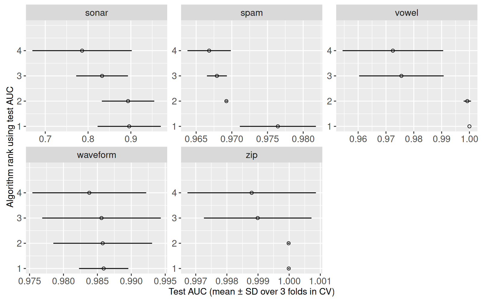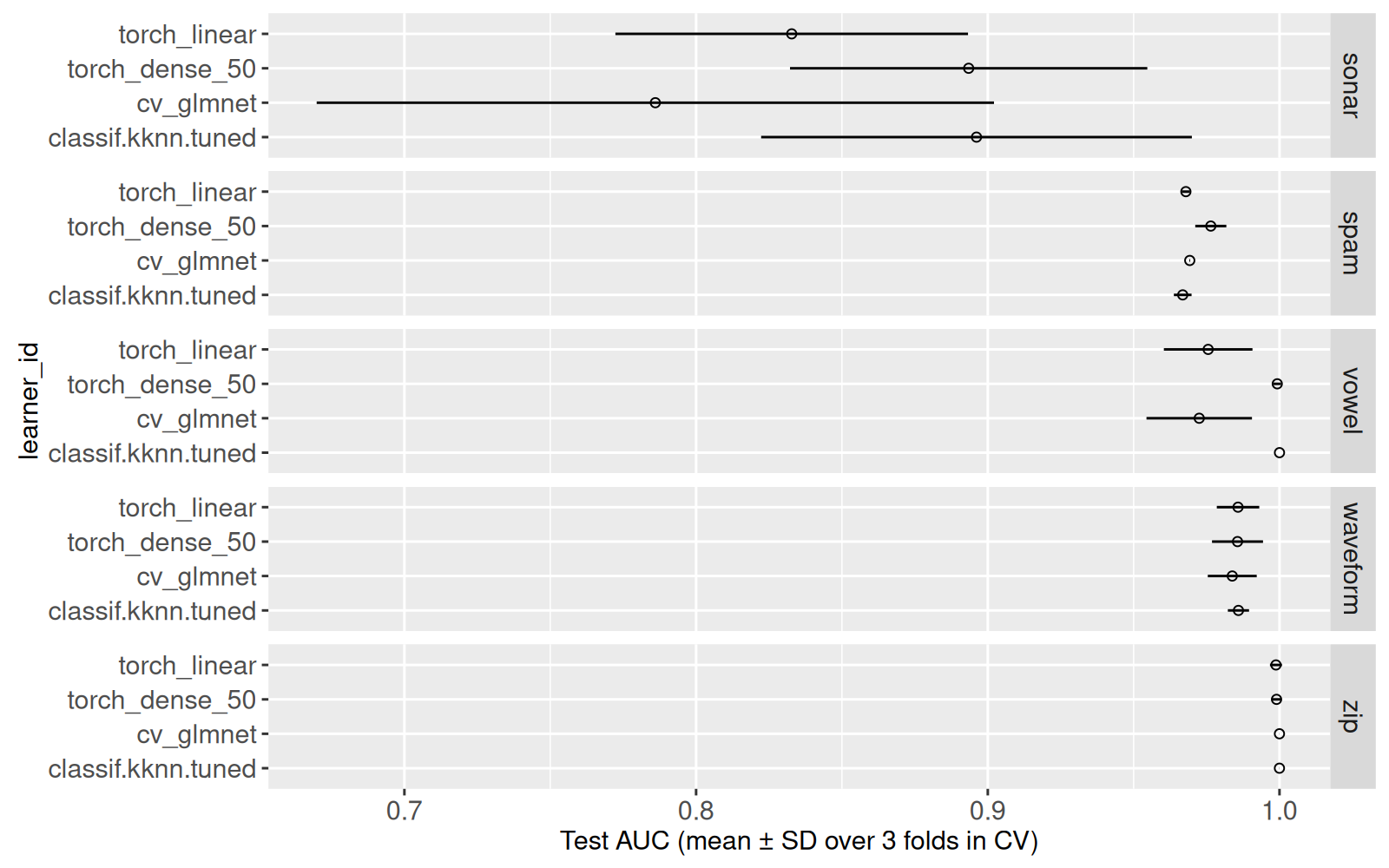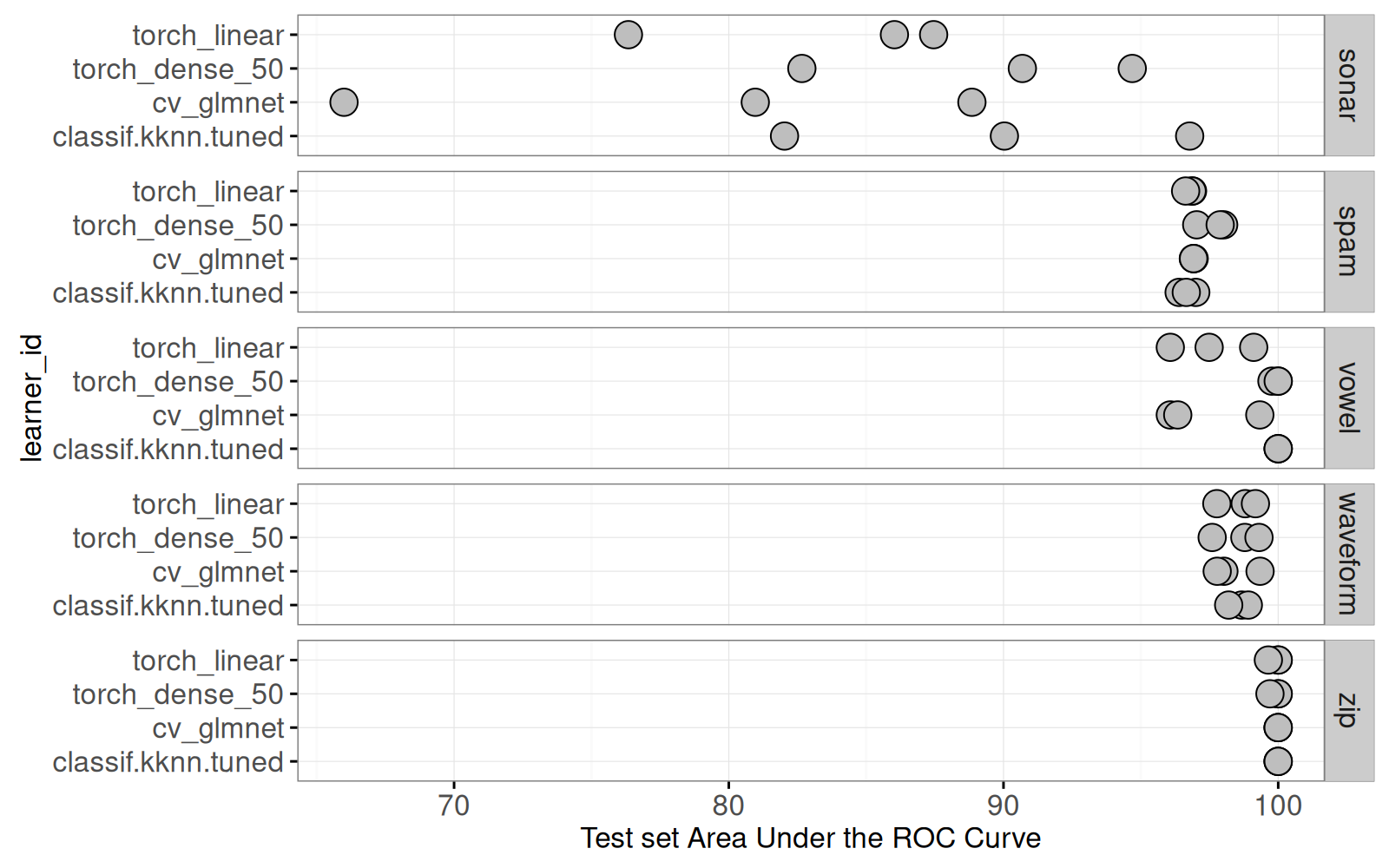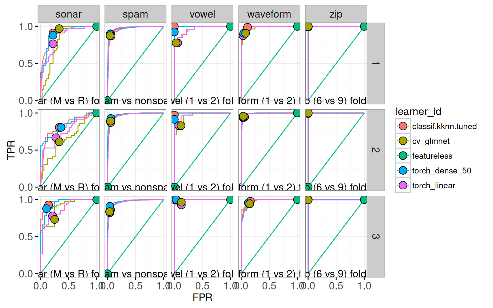 mlr3to define and execute a benchmark comparison using several binary classification problems, and several learning algorithms (nearest neighbors, linear model, neural networks). - We create various plots of test set error rates and Area Under the ROC curve.