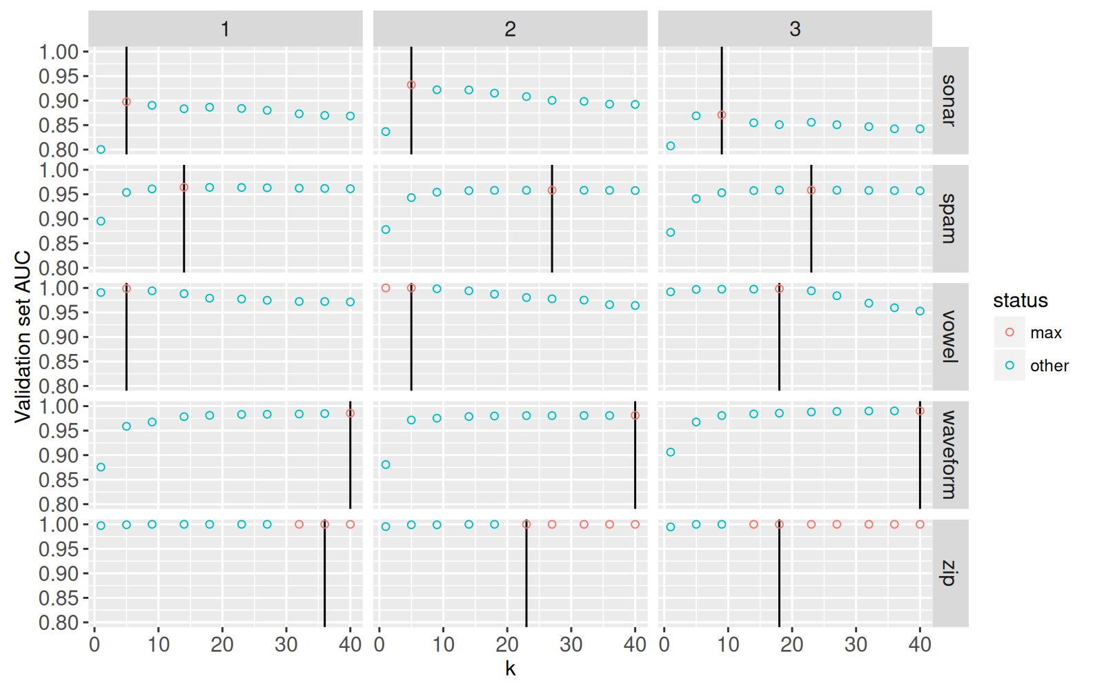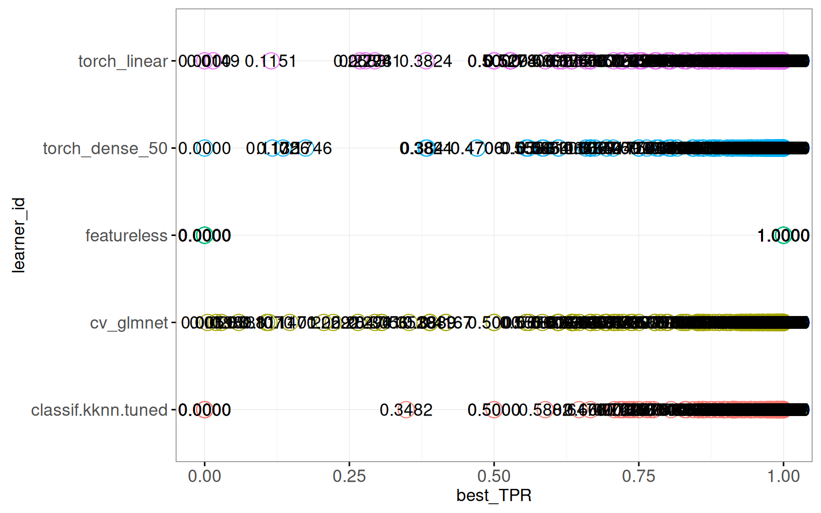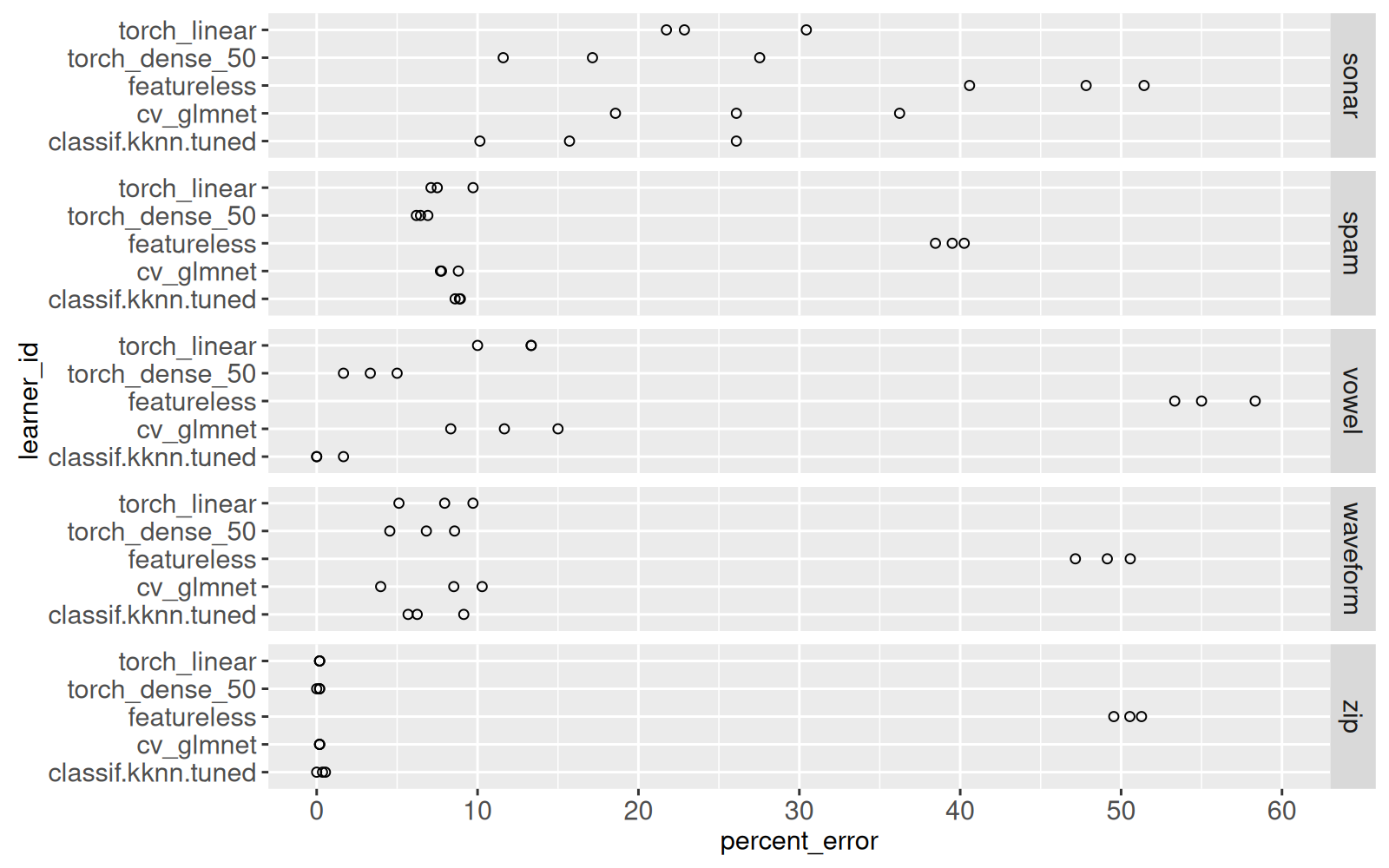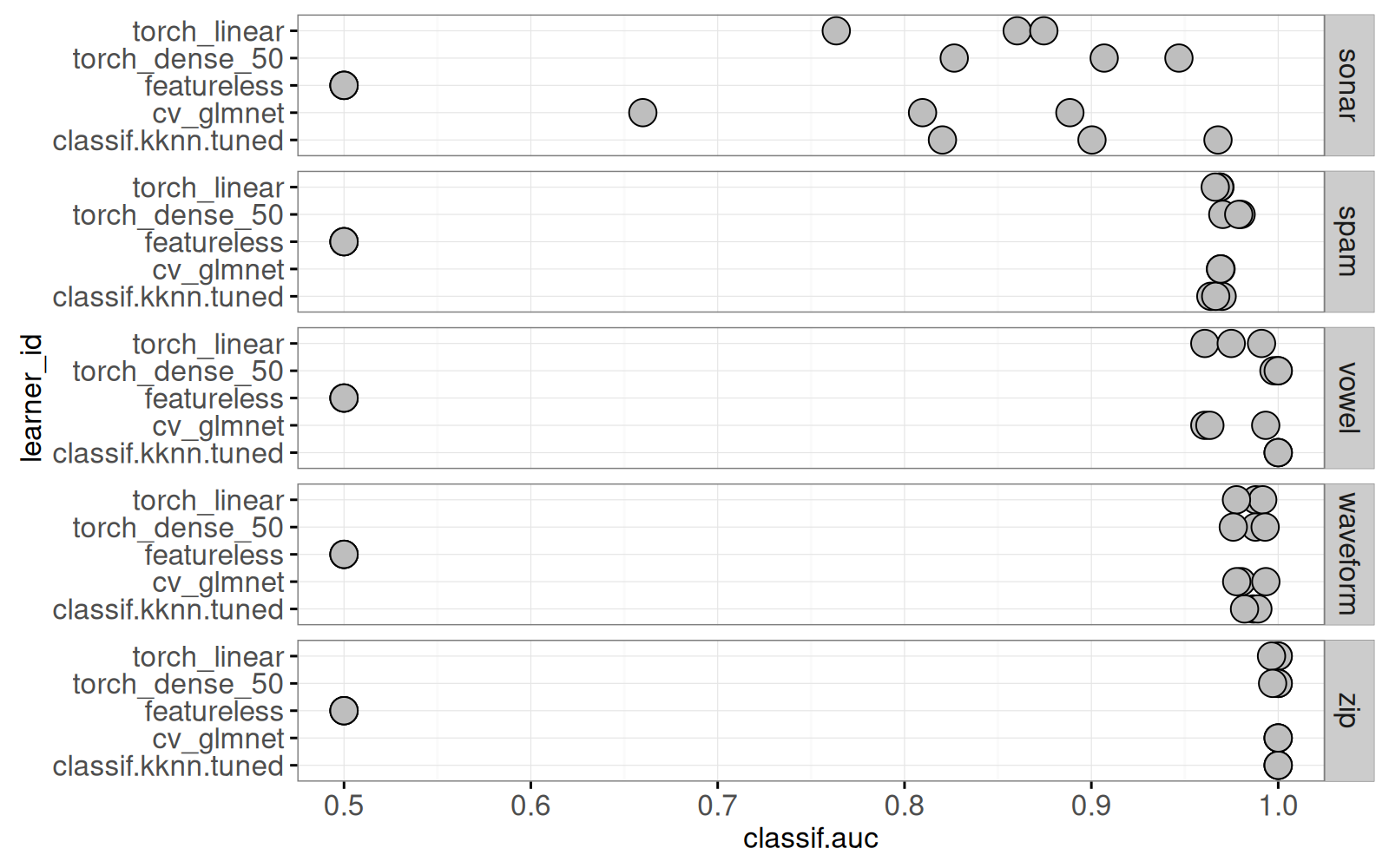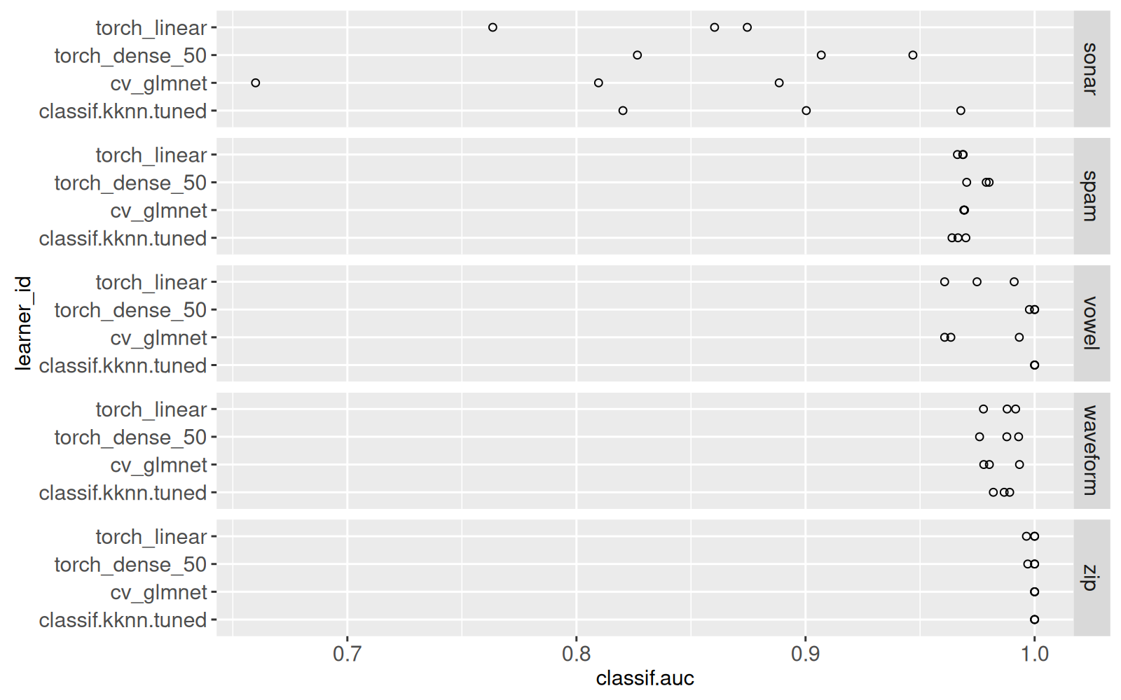 mlr3to define and execute a benchmark comparison using several binary classification problems, and several learning algorithms (nearest neighbors, linear model, neural networks). - We create various plots of test set error rates and Area Under the ROC curve.