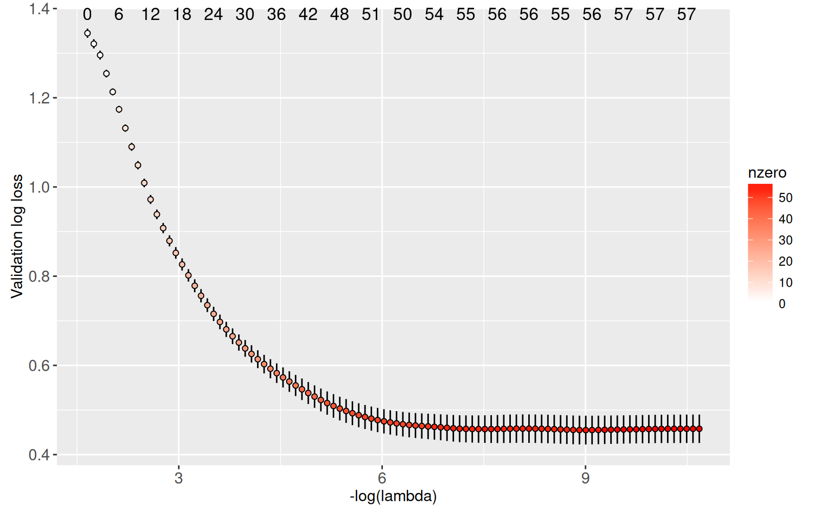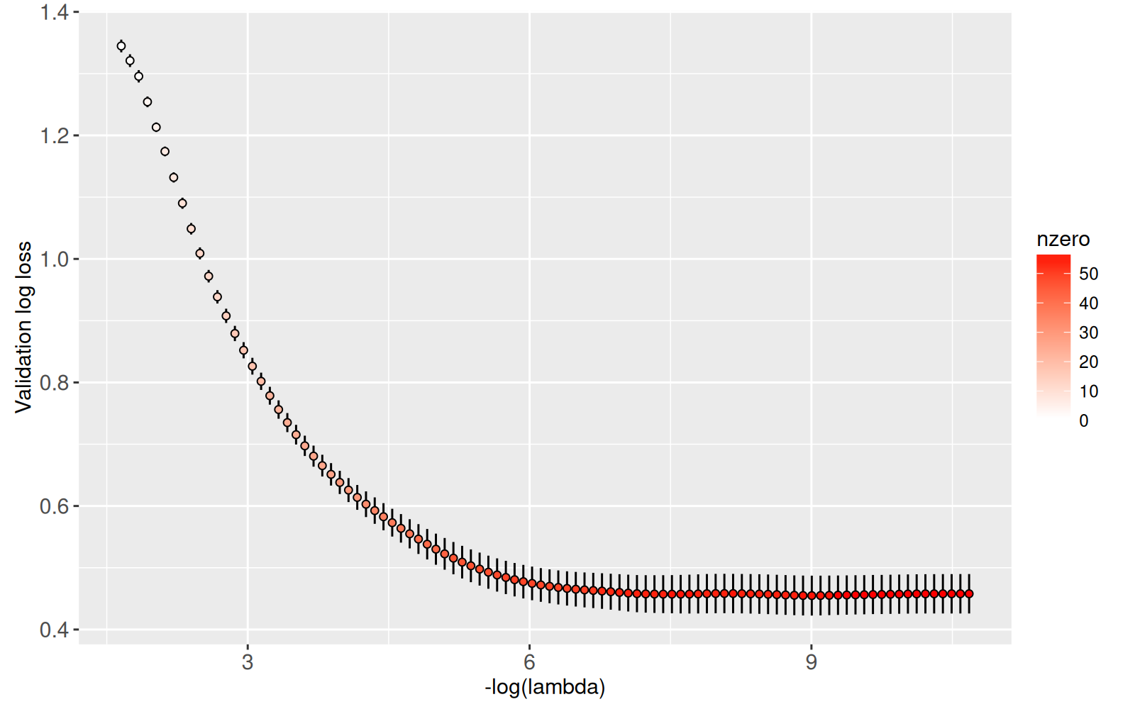 The plot above shows the validation set Binomial Deviance (same as log loss in previous section) as a function of the model complexity (measured by negative log penalty). We see the curve decrease, but not increase, which may indicate underfitting. To reproduce this plot, we use the ggplot code below.